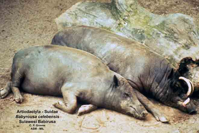 Pair lying side by side. Formerly Babyrousa babyrussa celebensis.