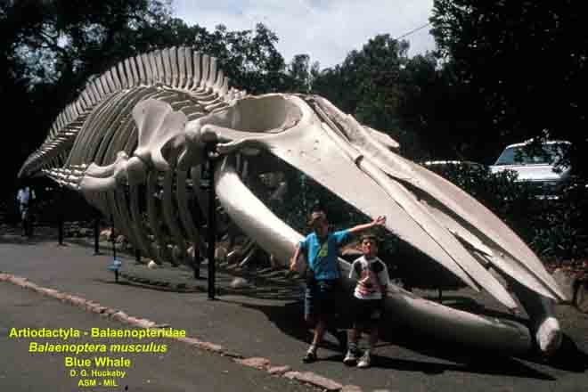 Three-quarter view (from front), showing entire skeleton but emphasizing skull, two persons in photo for scale. Formerly in order Cetacea.