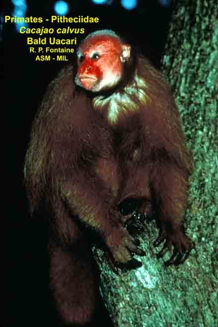 Front view of adult female. Cacajao calvus rubicundus. Also as Bald Uakari.