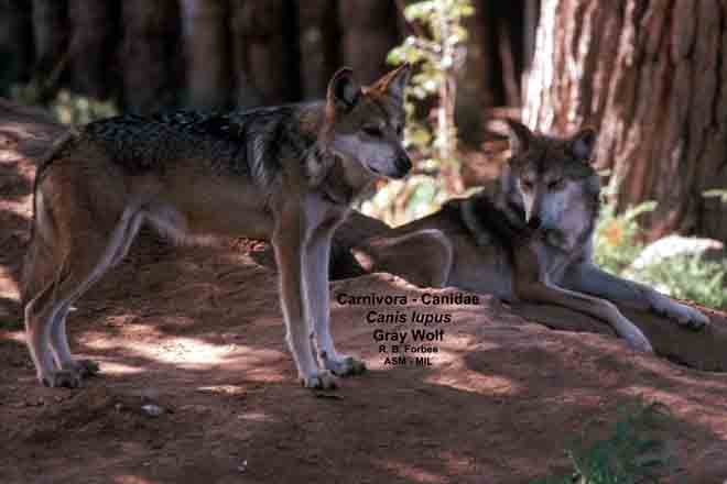 One individual standing, one lying, Canis lupus baileyi, Mexican Wolf. Also as Grey Wolf.