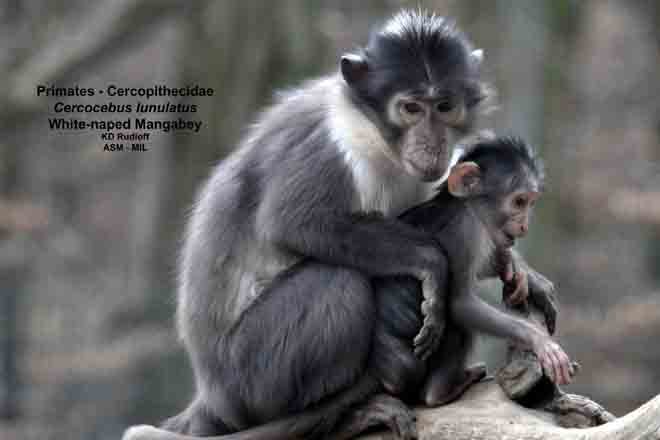 Formerly Cercocebus atys lunulatus. Also as Crescent-naped Mangabey|White-collared Mangabey|White-crowned Mangabey.