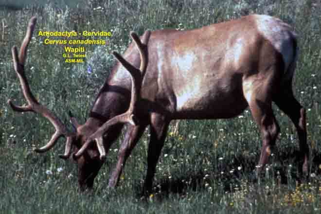 Side view of adult male with dorsal view of antlers. Cervus canadensis canadensis. Formerly Cervus elaphus canadensis, Red Deer. Also as American Elk.