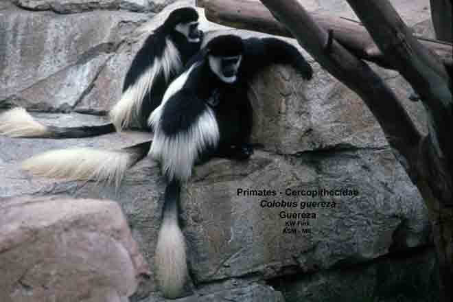 Two adults, showing tail. Also as Eastern Black-and-white Colobus|Magistrate Colobus|Mantled Guereza.