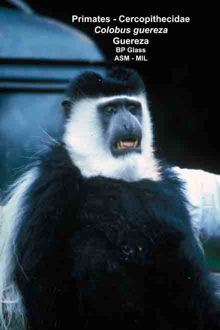 Front view sitting, Colobus guereza gallarum, Djaffe Mountains Guereza. Also as Eastern Black-and-white Colobus|Magistrate Colobus|Mantled Guereza.