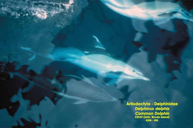 Dorso-lateral view of animal swimming underwater beside ship. Formerly in order Cetacea. Formerly as Delphinus capensis, Long-beaked Common Dolphin.