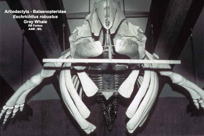 Anterior view of mounted skeleton [bar represents 1 meter]. Formerly in order Cetacea. Formerly in Eschrichtiidae.