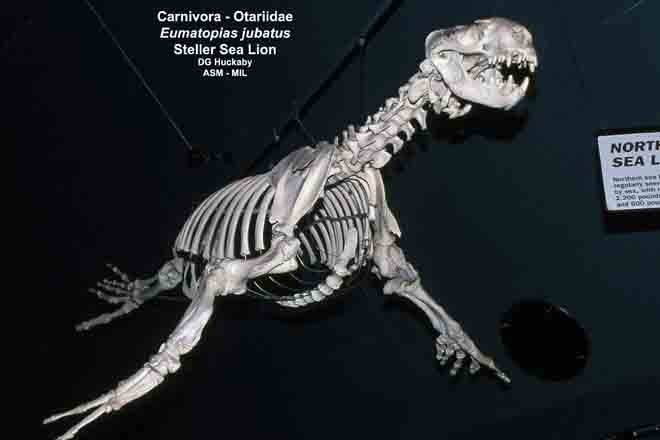 Front, quartering view of mounted skeleton. Also as Northern Sea Lion.