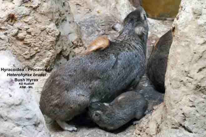Female suckling young with hairs around dorsal gland erect. Also as Yellow-spotted Rock Hyrax.