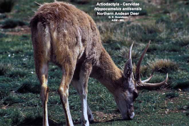 Oblique view, adult male grazing. Also as Northern Huemul|North Andean Huemul|Peruvian Heumul|Taruca.