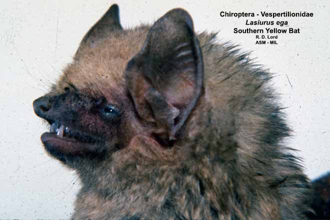 Close-up sideview of head, teeth visible. Formerly Dasypterus ega.