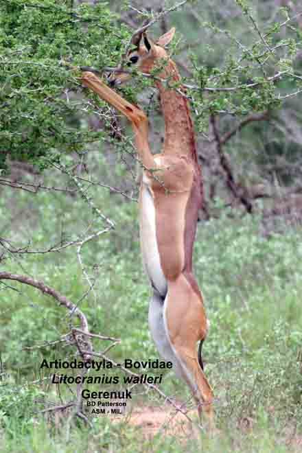 Adult male, side view, on hind limbs with head in tree. Litocranius walleri walleri. Also as Southern Gerenuk.