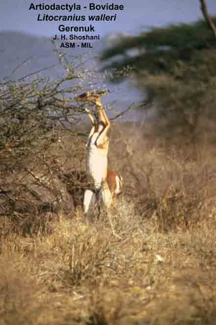 Standing on hind legs in typical feeding posture. Litocranius walleri walleri. Also as Southern Gerenuk.