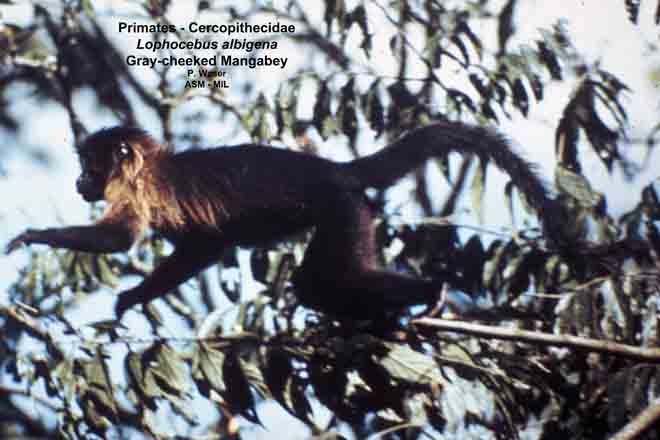 Side view leaping from branch. Lophocebus albigena ugandae, Ugandan Gray-cheeked Mangabey. Formerly Lophocebus ugandae, Ugandan Crested Mangabey. Also as Cloaked Mangabey|White-cheeked Mangabey.