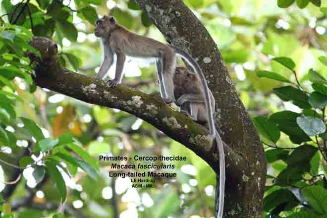 Two animals, interacting; head and tail visible. Also as Crab-eating Macaque|Longtail Macaque.