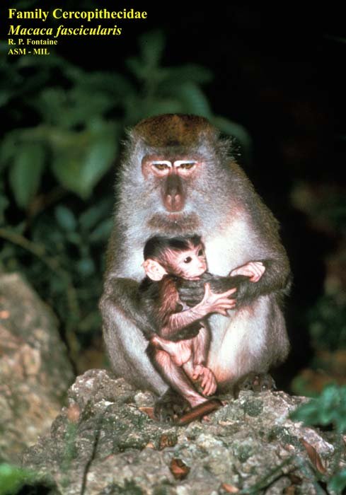 Front view, adult female with infant. Feet show well. Also as Crab-eating Macaque|Longtail Macaque.