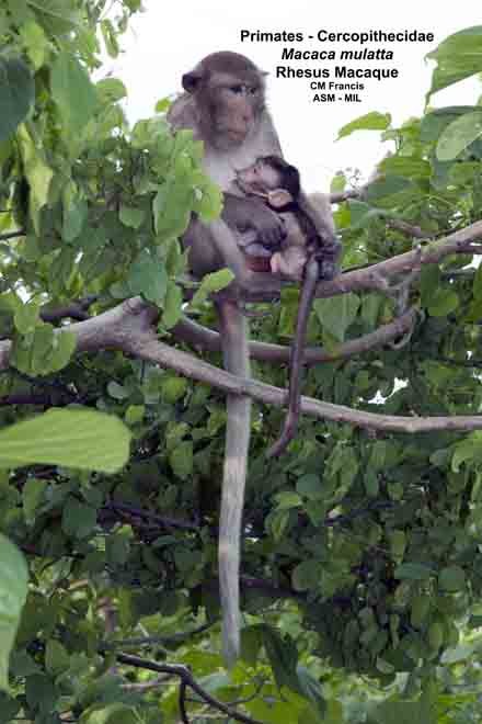 Adult female suckling infant. Also as Rhesus Monkey.
