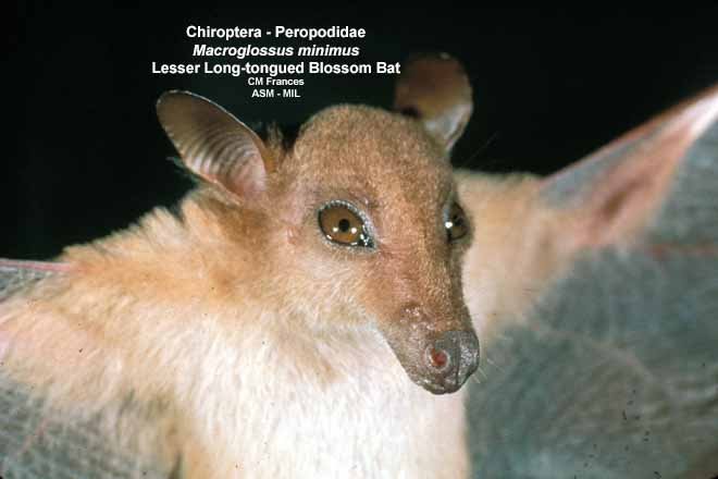 Close-up, wings open. Also as Dagger-toothed Flower Bat|Dagger-toothed Long-nosed Fruit Bat|Dagger-toothed Long-tongued Blossom Bat|Lesser Long-nosed Fruit Bat|Lesser Long-tongued Fruit Bat|Lesser Long-tongued Nectar Bat|Northern Blossom Bat.