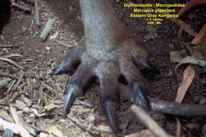 Close-up of front foot planted on ground, showing all digits clearly. Also as Eastern Grey Kangaroo.