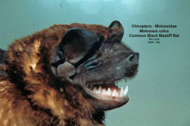 Close-up view with mouth open, teeth exposed. Also as Black Free-tailed Bat|Black Mastiff Bat.
