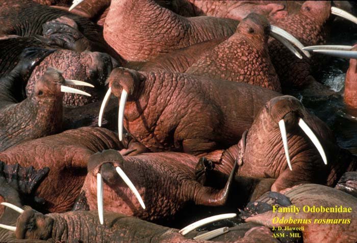 Group of males, includes front view of tusks. Odobenus rosmarus divergens.