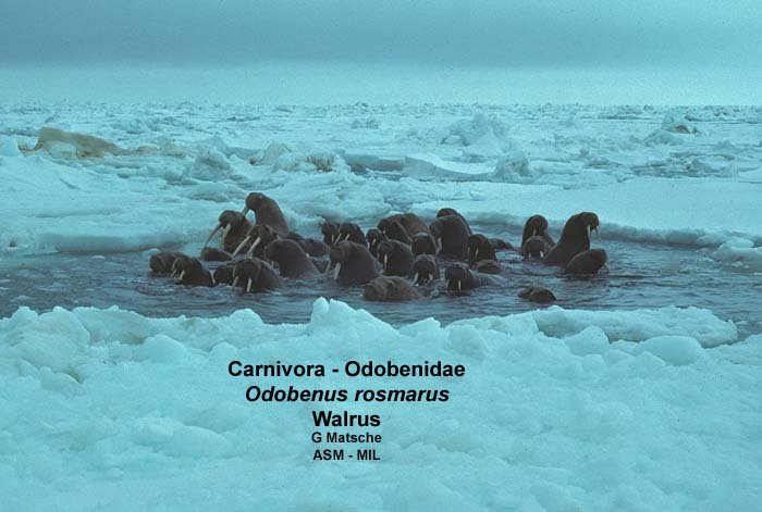 Small group in hole in pack ice. Odobenus rosmarus divergens.