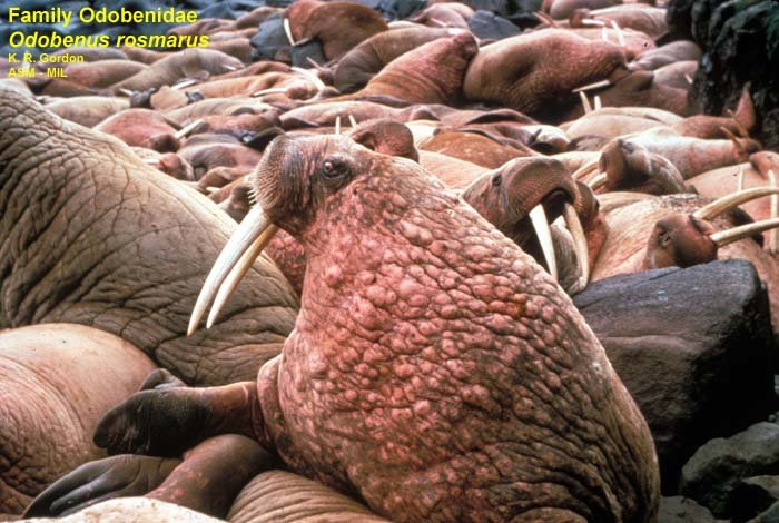 Close-up of head and forequarters of male in herd, Odobenus rosmarus divergens.
