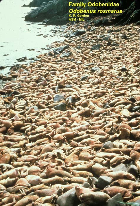 Large group hauled out on land, Odobenus rosmarus divergens.