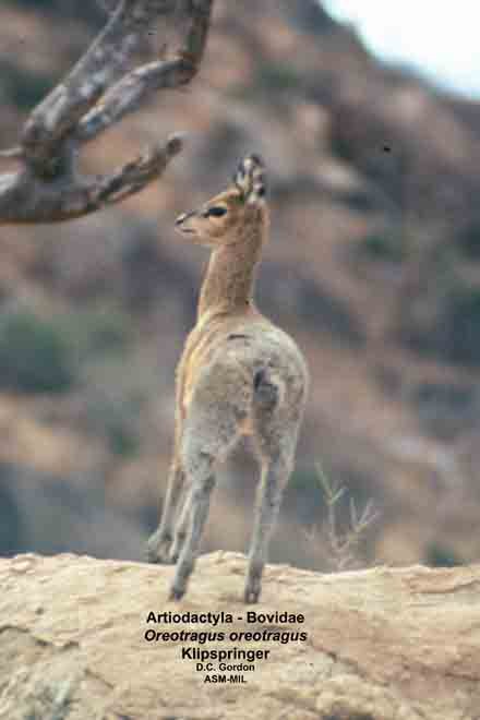 Rear view with side view of head. Oreotragus oreotragus schillingsi. Formerly as Oreotragus oreotragus saltatrixoides. Also as Oreotragus schillingsi, Maasai Klipspringer.