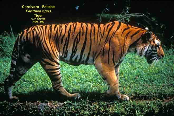 Side view, walking. Panthera tigris sondaica. Also as Panthera sumatrae, Sumatran Tiger.