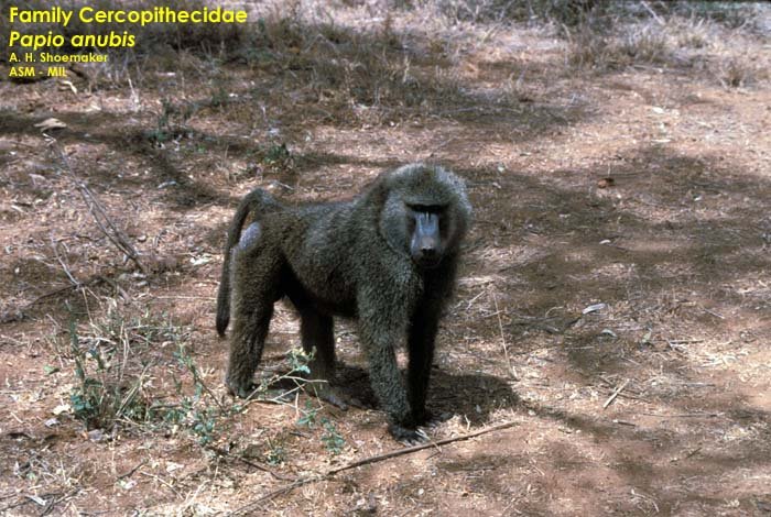 Oblique front view of male in quadrupedal stance. Also as Anubis Baboon.