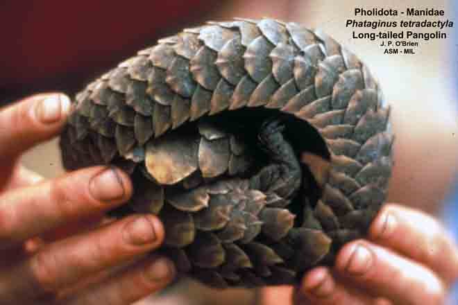 Hand-held, animal coiled up. Formerly as Manis tetradactyla.