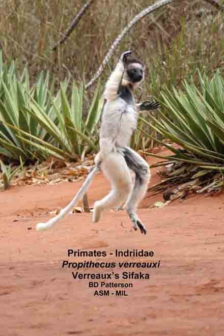 Adult, suspended in air during bipedal half-bound. Also as White Sifaka.