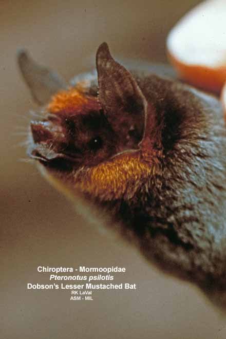 Close-up of head, oblique view. Also as Dobson's Mustached Bat. Formerly Pteronotus personatus psilotis.