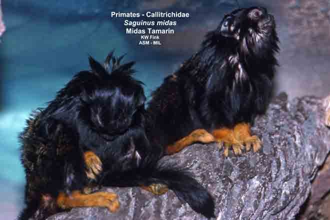 Two adults, showing all feet and tail. Also as Golden-handed Tamarin|Red-handed Tamarin|Yellow-handed Tamarin. Formerly Cebidae (Callitrichinae).