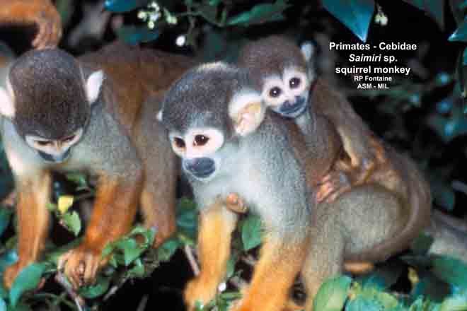 Two adults and a juvenile in tree. Formerly Saimiri sciureus.