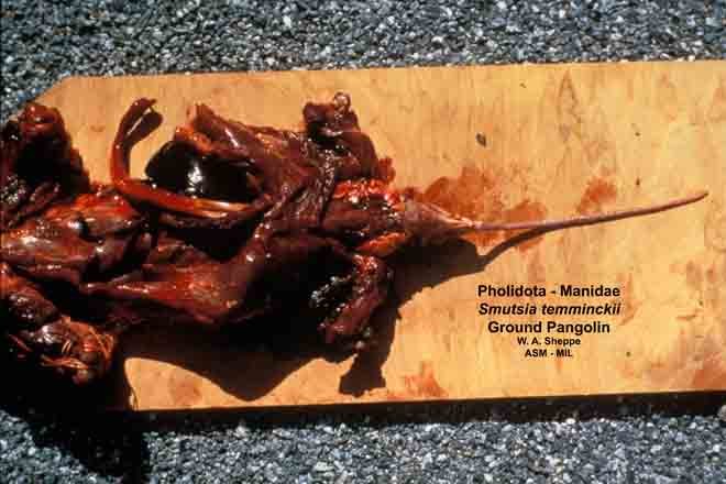 Carcass of skinned specimen, showing extent of tongue (internal portion 35 cm long, external portion 20 cm long). Formerly as Manis temminckii.