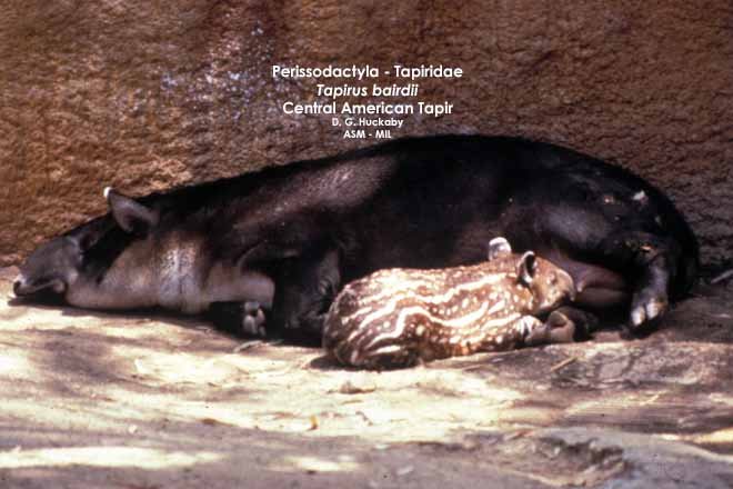 Female nursing young, lying on ground; also as Tapirella bairdii. Also as Baird's Tapir.
