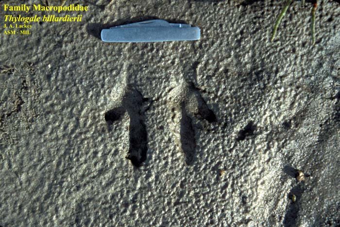 Prints of hind feet, in mud, prints 7-8 cm in length. Also as Tasmanian Pademelon.