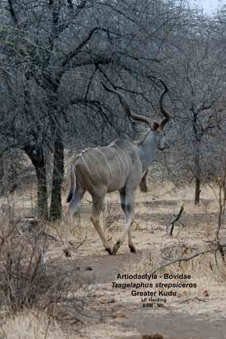 Rear, quartering view of trotting adult male. Tragelaphus strepsiceros zambesiensis. Also as Strepsiceros zambesiensis, Zambezi Kudu.