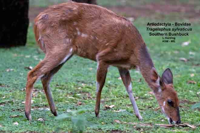 Side view of grazing female. Tragelaphus sylvaticus sylvaticus. Formerly Tragelaphus scriptus sylvaticus. Also as Sylvan BushbucklCape Bushbuck|Imbabala|Eastern Bushbuck. Also as Tragelaphus scriptus roualeynei, Limpopo Bushbuck.