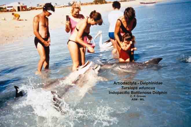Small school interacting with people near beach. Formerly in order Cetacea.