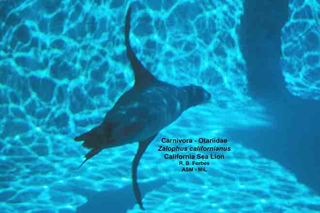 Dorsal and posterior view of individual swimming, showing extensive span of front flippers as sea lion changes swimming direction