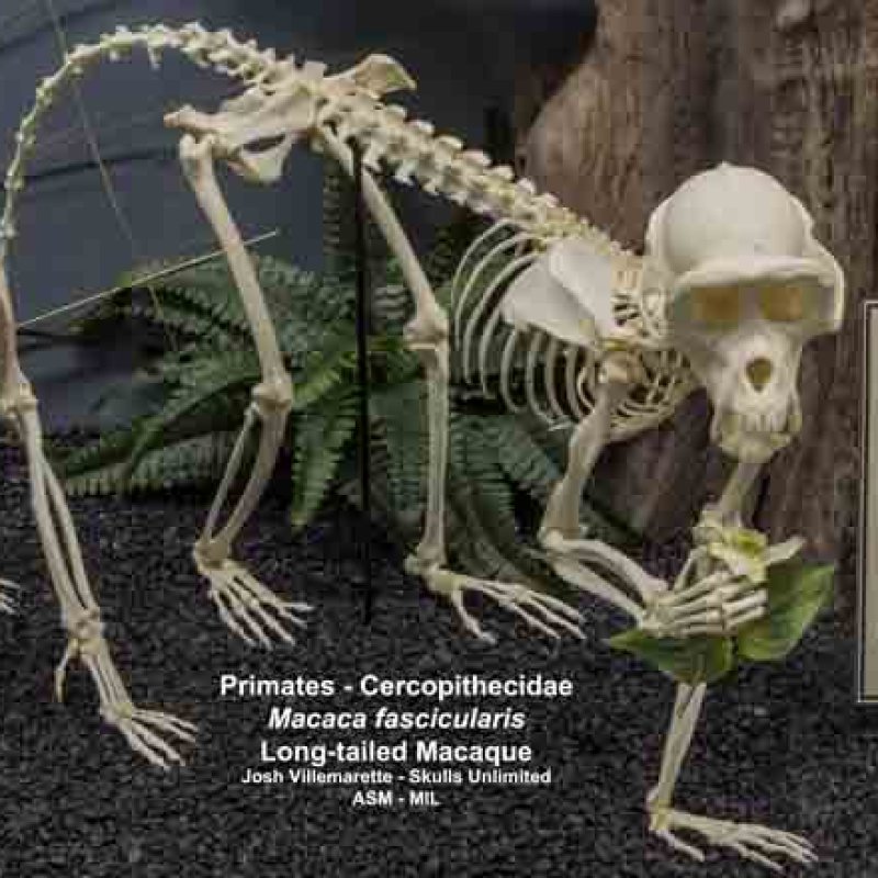 Diagonal anterior view of mounted skeleton standing on three feet. Also as Crab-eating Macaque|Longtail Macaque.