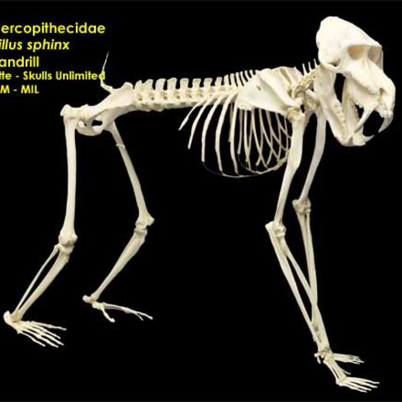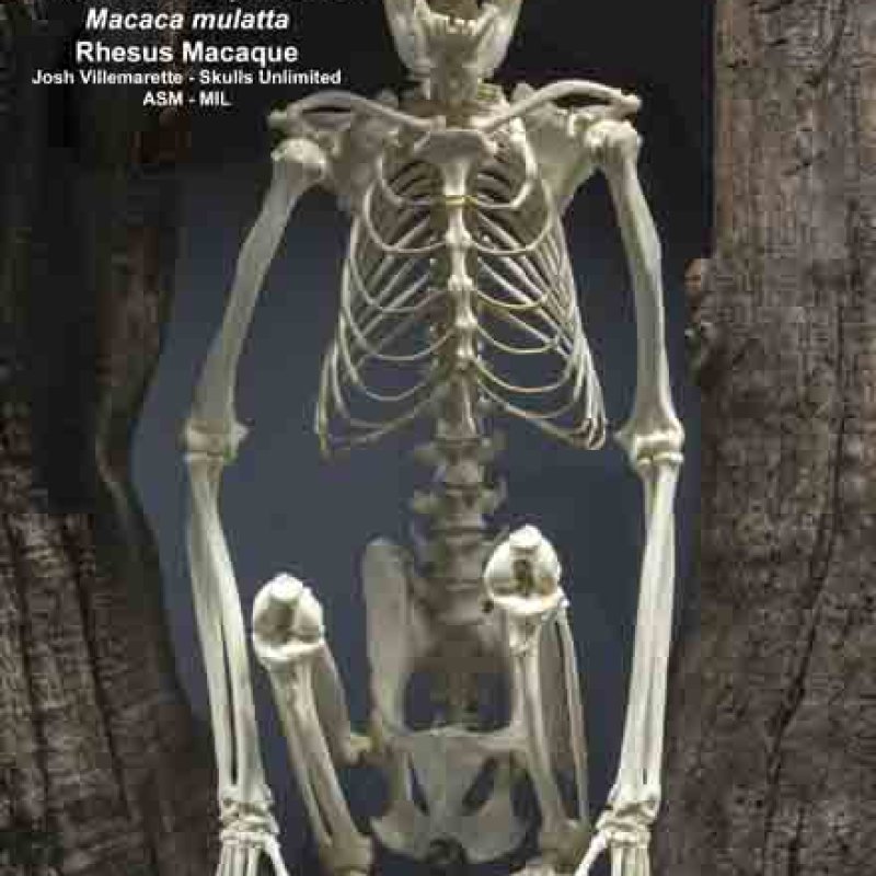 Anterior view of mounted skeleton sitting in crotch of tree with mouth open. Also as Rhesus Monkey.