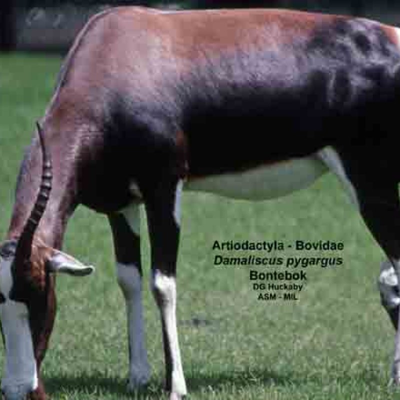 Side view of standing adult, showing face and rump. Damaliscus pygargus pygargus.
