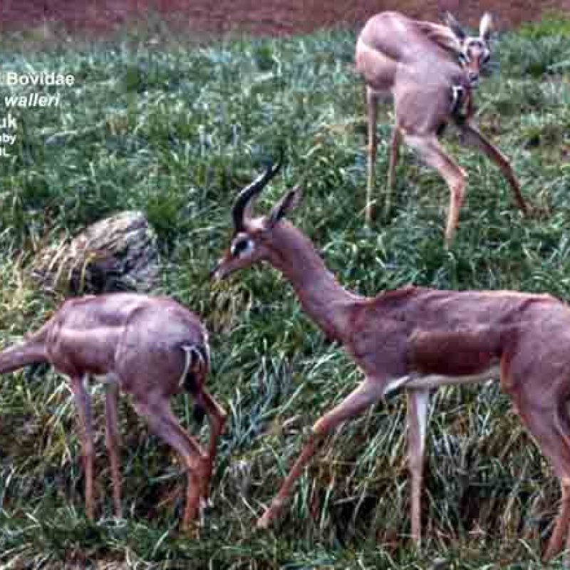 Male leg kicking female. Litocranius walleri walleri. Also as Southern Gerenuk.