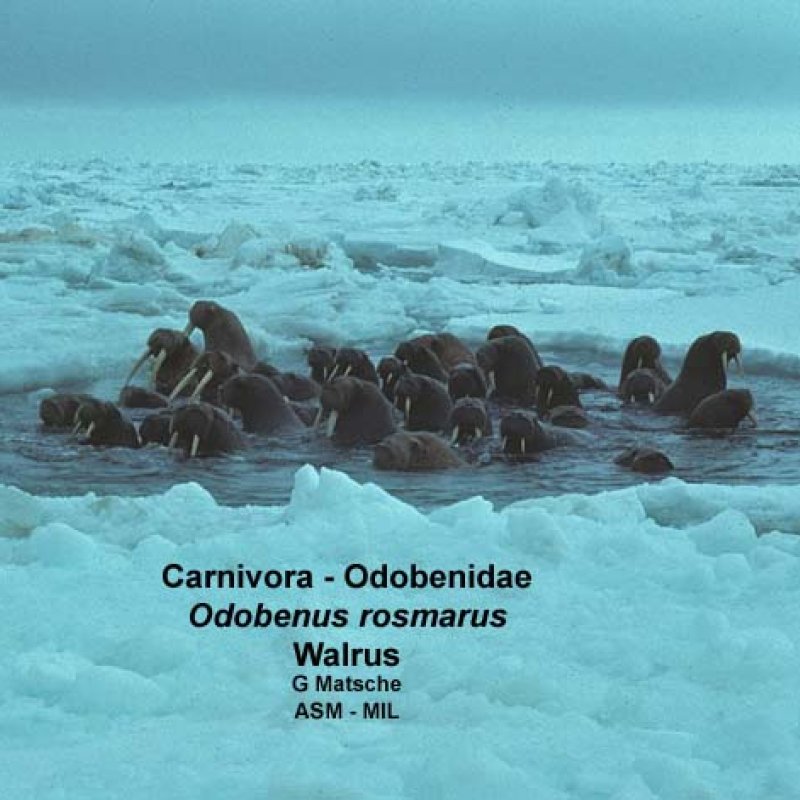 Small group in hole in pack ice. Odobenus rosmarus divergens.