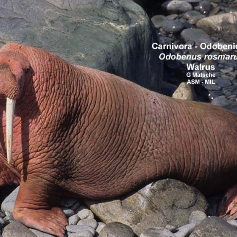 Adult male lying on back on land. Odobenus rosmarus divergens.