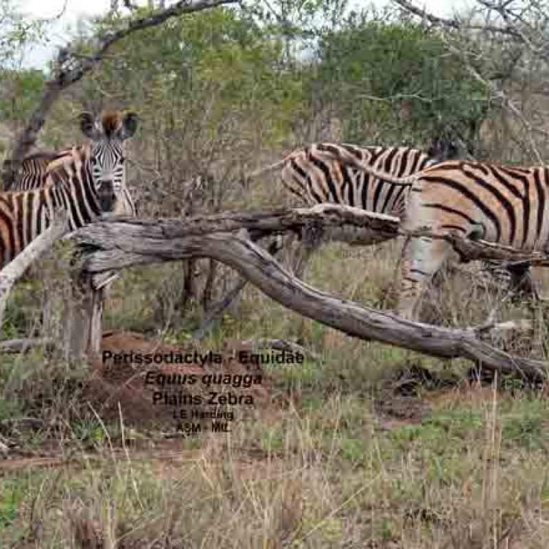 Equus quagga burchellii, Burchell's (Damara or Zululand) Zebra or Bontequagga. Also as Equus burchellii burchellii. They seem to have some genes of the extinct Quagga; note the brown stripes on a brown background on rumps and absence of "shadow" stripes on two animals in foreground, and reduced stripes on rump and legs of the one at right. Also as Common Zebra.