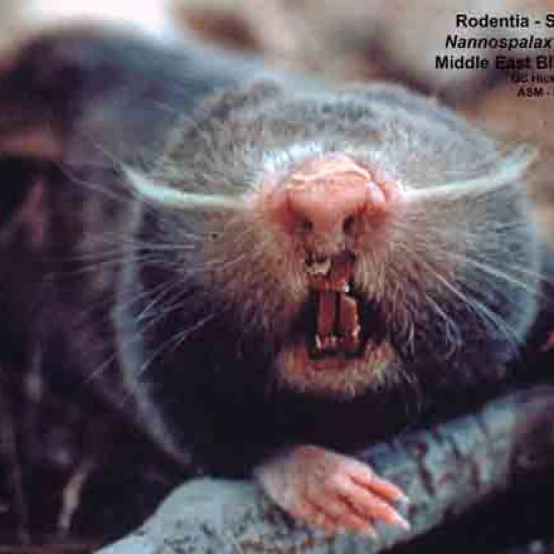 Close-up of head, showing incisors and forefeet. Formerly Spalax ehrenbergi.